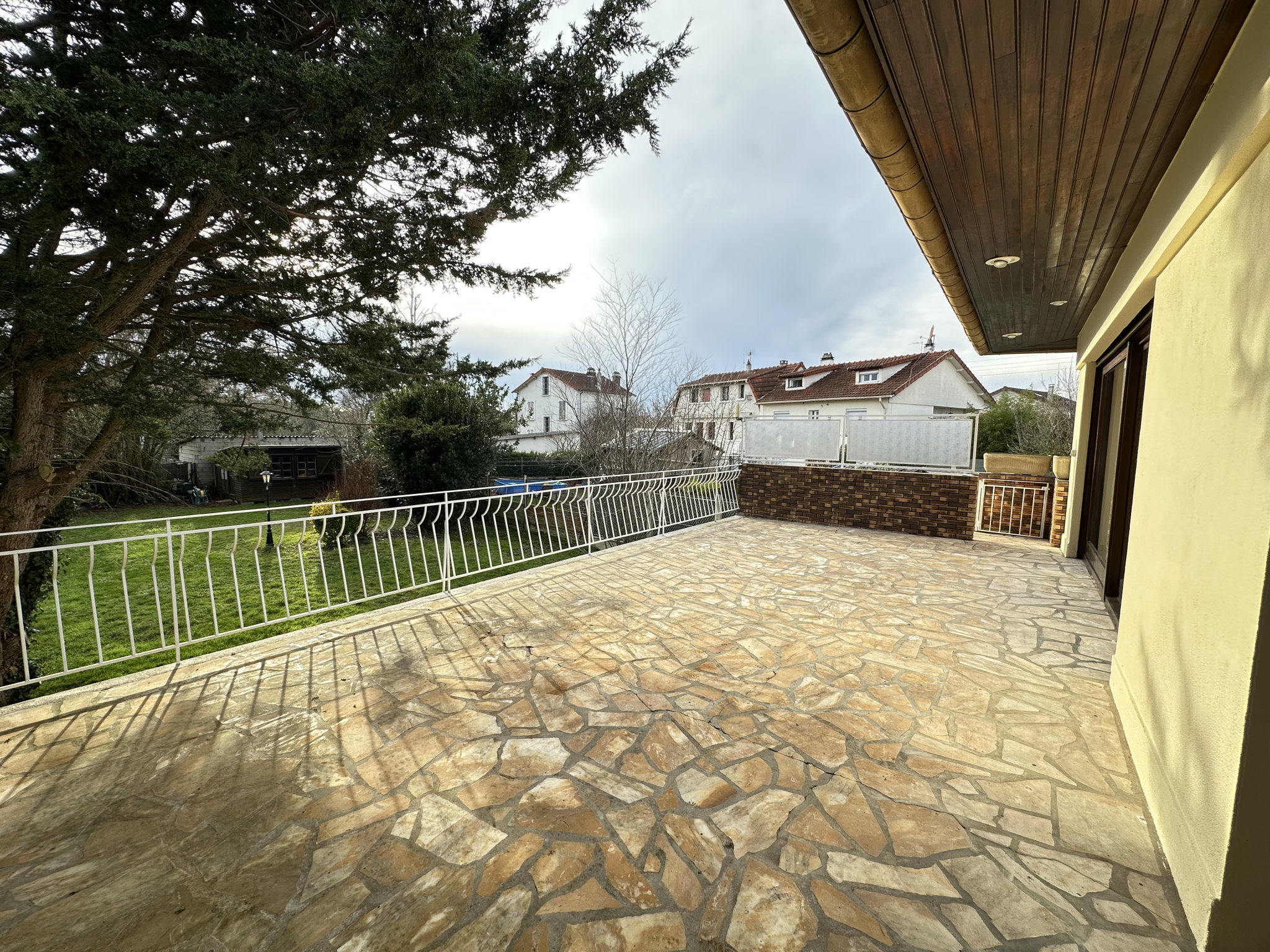 Quartier Franceville, au calme, à proximité des écoles, maison familliale indépendante de 245 m² UTILES sur terrain SUD sans vis-à-vis de 750 m² comprenant en rez-de-jardin, une entrée avec placards, un dégagement, une chaufferie gaz, 3 chambres, un séjour + coin kitchenette avec une entrée indépendante, une salle d'eau avec wc, rangements. Au rez-de-chaussée surélevé, un séjour de 35 m² avec cheminée accès terrasse sud de 40 m², une cuisine indépendante, 2 grandes chambres dont une de 16 m², une salle d'eau, wc. Jardin d'hiver. 2 grands garages, une cave. Chauffage gaz individuel. Beau volume, lumineux et nombreux stationnements. Abri de jardin. Ensemble à moderniser. Arrêt de bus à proximité pour gare RER. Honoraires d'agence charge vendeur. Les informations sur les risques auxquels ce bien est exposé sont disponibles sur le site Géorisques